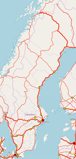 Figur 2. TEN-T nätverket i Sverige (gula punkter är urbana noder) Källa: TENtec Map Viewers - Explore the TEN-T Network | European Transport Infrastructure